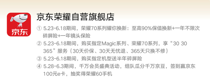 买荣耀产品,享极致服务。京东荣耀自营旗舰店“耀你焕新”,5.23-6.18期间,荣耀70系列享受至高90%保值换新+一年不限次碎屏险+一年镜头保险。此外,购买指定Magic系列、荣耀70系列,享“30 30 365”服务(30天价保、30天无忧退、365天只换不修)。为科技生活提供超值售后保障、全方位贴心服务。