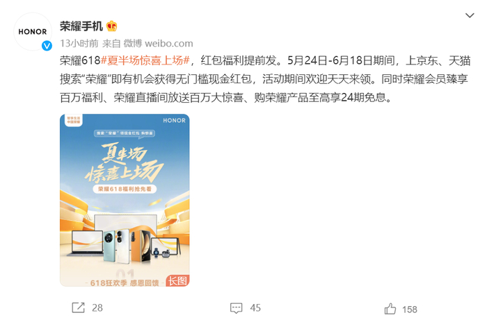 荣耀公布618预热指南 搜荣耀领红包瓜分百万现金