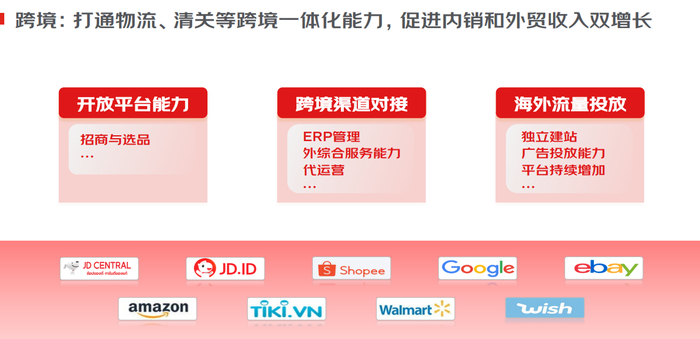 同时依托京东生态能力,京东商羚跨境平台,能够帮助电商企业打通物流、清关等跨境一体化能力,通过跨境渠道对接、海外流量投放等,可以促进商家内销和外贸收入双增长。京东成熟商业体系作为商羚业务开展的强大后盾,提供物流、金融、客服售后等基础设施能力,真正实现为中小商家卖货更容易。