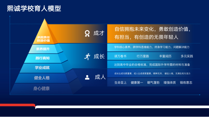 为了达成这一教育目标,熙诚学校设计了“金字塔育人模型”来实现“成人,成长,成才”的育人蓝图。并针对性地搭建了“核心学术课程”、“精神品格成长课程”及“专业方向探索课程”三大课程群,覆盖熙诚学子的科学素养、数字素养、数据素养、审美素养、健康素养、阅读素养、计算素养七大培养领域。