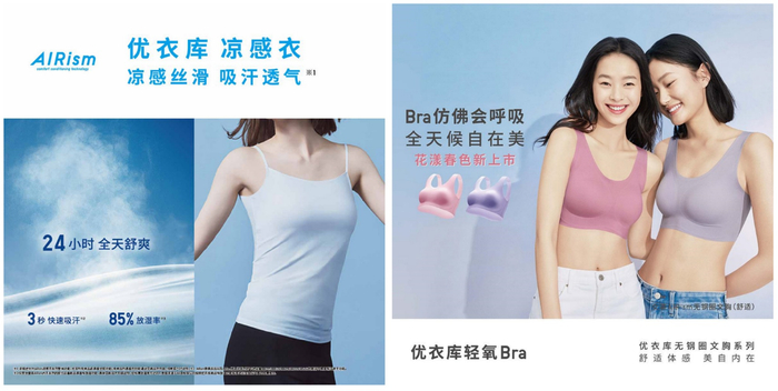 优衣库AIRism凉感衣系列 1瞬间接触凉感、3秒快速吸汗、85%放湿率、24小时全天舒爽!全球热销10年,涵盖经典系列、网眼系列、棉混纺系列、男士内裤系列等丰富产品线。AIRism凉感打底衫,凉感透气贴身柔软,自带胸垫更舒服,美由内而外。全球首发轻氧Bra花漾新色上市,同样采用AIRism科技面料,裸感透气高弹舒适,自 2021年10月至今于中国大陆地区爆款热卖50万件,全天候自在美。