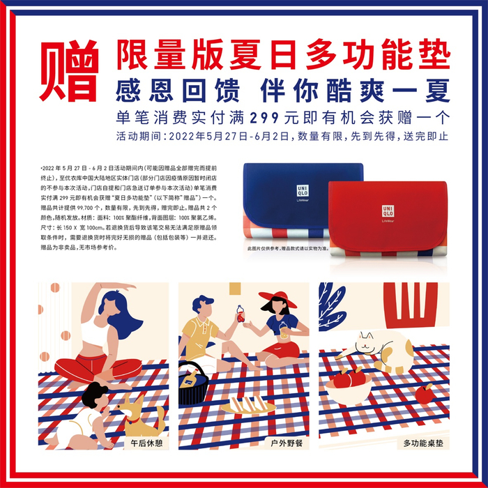 限量版夏日多功能垫 满即赠,伴你舒爽一夏!5/27-6/2,在线下实体店、掌上优衣库、优衣库天猫旗舰店,单笔实付满299元即有机会获赠一个;6/3-6/9,支付宝扫描店内二维码注册优衣库会员,感谢券199-15 限时领!
