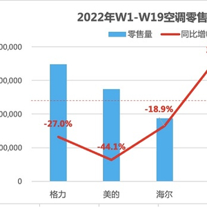 中怡康数据显示,截止2022年5月15日,中国空调行业销售量627.8万套,同比下降28.3%。