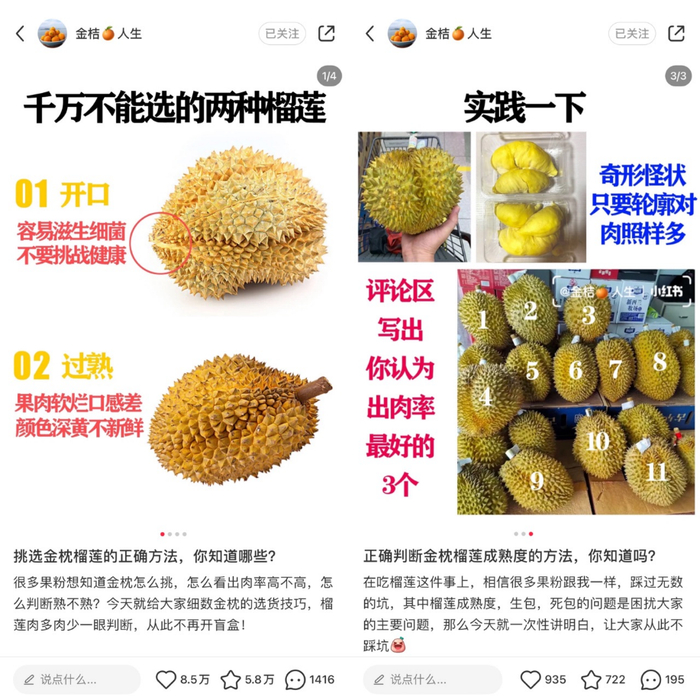 “发攻略的初心比较简单,就是因为自己太喜欢吃榴莲也踩过不少坑,就把经验总结下发到了小红书。”金桔人生说:“我也不是百万大V,没想到这么多人看,有网友学了我的攻略来‘交作业’的,或者走到水果店给我私信要‘现场抄作业’的,后来我就干脆写完攻略给大家布置了课后作业,大家反应很热烈,我也觉得帮助到别人很开心。”