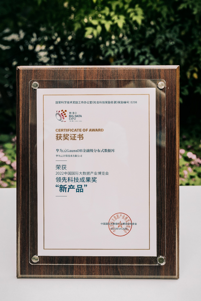 在数博会的重头戏——“数博发布”特色活动中,华为云GaussDB(for openGauss)金融级分布式数据库斩获领先科技成果“新产品”奖。该奖项是唯一以大数据为主题的社会科技奖励,其专业性、权威性、引领性获业界一致认可。