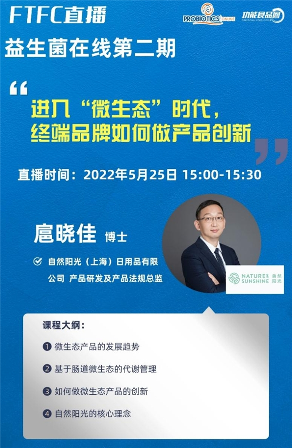 近日由食品伙伴网联合国际益生菌协会(IPA)、美中健康产品协会(HPA)开展的FTFC系列“益生菌在线”第二期线上课程顺利开课,自然阳光产品研发及产品法规总监扈晓佳博士受邀参加,分析了“进入‘微生态’时代,终端品牌如何做产品创新”这一命题,并耐心地回答了直播间用户提出的多个问题。本次线上直播课聚集行业头部企业,邀请了多位功能食品行业相关的从业人员参与并发言,针对益生菌行业相关趋势、企业相关研究等角度展开讨论,共同展望全球益生菌产业布局与方向。