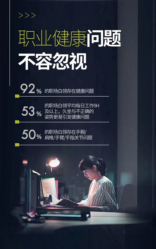根据调研数据,92%的职场白领存在健康问题,53%的职场白领平均每日工作9h及以上,久坐与不正确的姿态引发的健康问题,50%的职场白领存在手腕、肩锥、手臂、手指关节等问题。