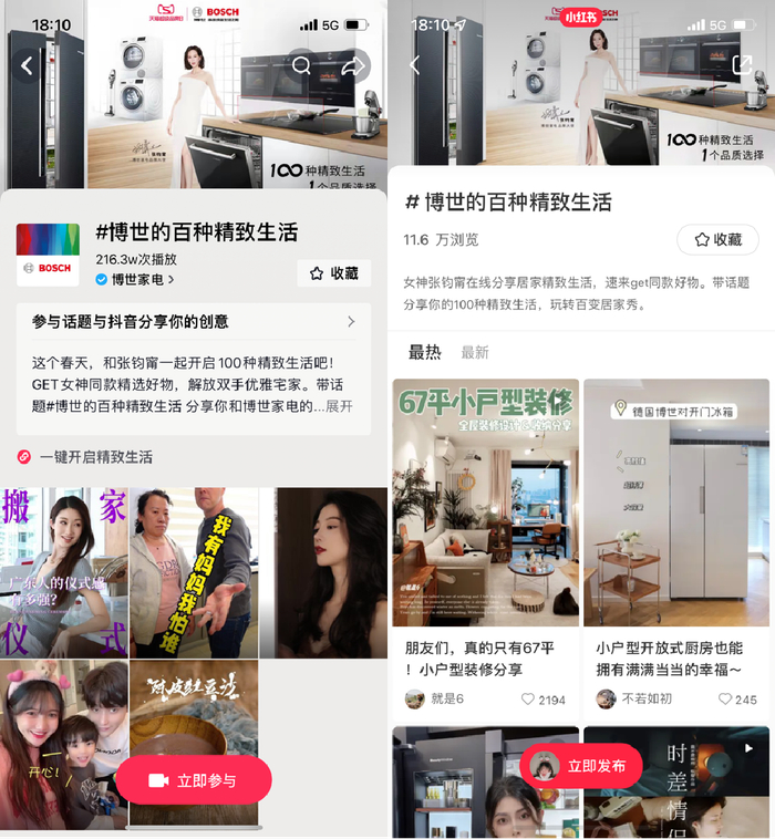 近日,博世家电首次联合天猫超级品牌日,携手品牌大使张钧甯发起全域营销大事件,通过系列线下创意体验活动,以及博世真实用户在线分享,共同记录展示博世家电为大众带来的“百种”精致生活瞬间,从而全面传递高品质家电品牌心智,并最终在活动期间以超2300万成交额、超2万新增会员的优异表现,成功为618大促引流蓄水。