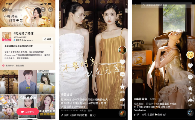 其次,为与用户进一步达成有效沟通,拉近用户距离,抖音电商超级品牌日同时还基于主题及热榜话题,定制了能够更好对主题进行诠释及渗透的挑战赛玩法——#时光错位大片 变装挑战赛。以金色调和珍珠元素体现品牌辨识度,以操作性强的玩法保持其可复制性,并基于对当下“新中式”、“大牌变装”等流行热点的洞察对挑战赛方向进行灵活变通。抖音电商超级品牌日从内容到形式将品牌语言具象化、social化、趣味化。以达人+KOC吸引更多用户参与,让雪花秀的品牌调性变得更有体感,在与用户成功对话的基础上释放雪花秀品牌调性。#时光错位大片 挑战赛邀请17位女性KOC参与,揽获浏览量超1202万。此次合作的变装达人个人属性时尚、视频风格精美,其粉丝受众刚好覆盖年轻、精致爱美的新中产女性这一精准的品牌目标人群,激发了潜在用户对挑战赛和品牌的了解兴趣。