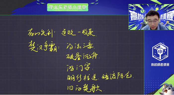 除了精彩的问答环节之外,李永乐老师为大家生动的讲解了游戏策略玩法背后的小知识。比如,针对“空城卖血流”,即通过故意降低血量获得更多金币,方便后续集中抽牌的玩法,李永乐老师就从“存心失利”这个海克斯展开,介绍了历史上也存在的“存心失利”的案例,比如“约法三章”、“破釜沉舟”等历史故事,讲述了楚汉争霸时期刘邦利用“存心失利”的策略收敛锋芒,积蓄实力,才让对手放松警惕,最终成就了天下霸业,也让我们看到金铲铲一个海克斯背后蕴含的策略与智慧。