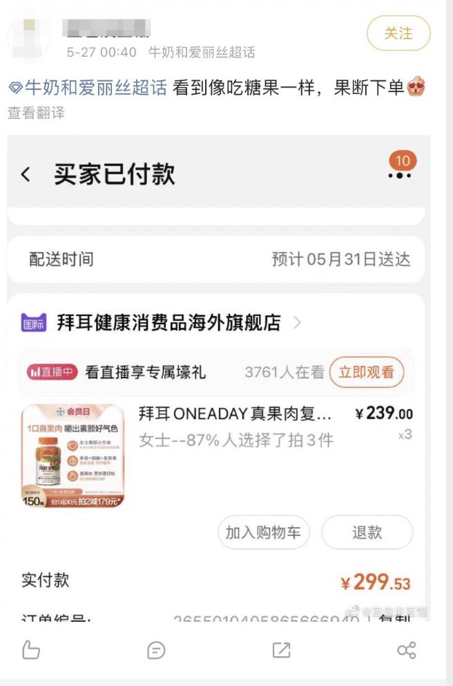 今年618的预售中,记者还观察到一个新趋势。许多健康食品、服饰也受到了大家的青睐,除北上广外,还有来自深圳、杭州、苏州、重庆、武汉、东莞等城市的网友,在社交平台上晒出了自己购物车,里面有膏药贴、血糖用品、养生茶,还有钙片、维生素、蛋白粉、软骨素、熬夜保肝片等.......