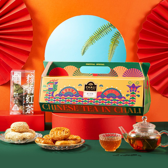 茶里推出的端午龙舟礼盒,在包装上融合了龙舟的修长形态,一眼出圈。它主打“地道粽叶红茶+国风潮式糕点”,以潮汕传统饼食,将国潮跨界玩的品味俱佳。“喜提龙舟”的设计灵感,更是将礼赠情怀升至燃点,寓意吉祥美好、风调雨顺、国泰民安。