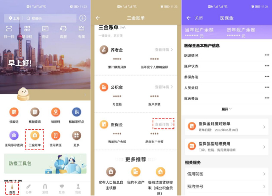 市民登录“随申办”APP→点击“三金查询”→点击医保金的“查看详情”,即可查看到包括个人医保账户状态、当年账户余额、历年账户余额、医保金月度对账单、医保就医明细费用记录等多类信息。
