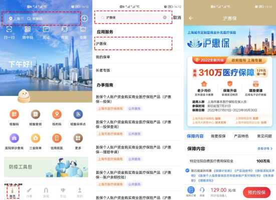 1、实名登录“随申办”APP,首页搜索“沪惠保”,人脸识别后进入“沪惠保”投保服务页面;