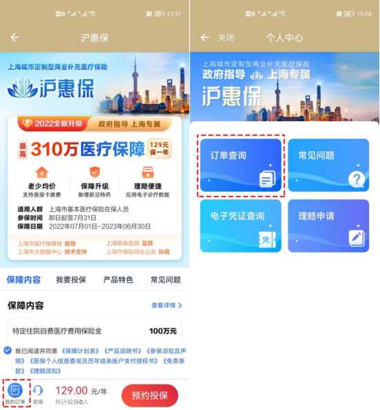 (2)通过“沪惠保”微信公众号→服务中心-个人中心-我的订单查询。