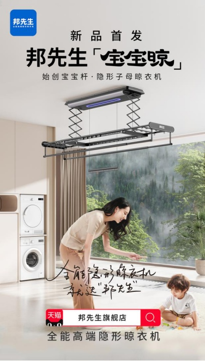 从传统晾衣架到电动晾衣架,再到如今的全能智能晾衣机;从杂乱阳台到简净阳台,再到个性化、功能化的阳台空间。邦先生的每一次创新升级,都是对美好生活的提案——技术始终在变,唯一不变的是提升晾晒体验的初心。在深耕智能晾衣机领域的第十年,邦先生终于成长为赛道王者,真正做到“把空间还给阳台,把爱还给生活。”