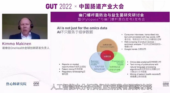 诺维信OneHealth全球创新研发负责人Kimmo Makinen在会上发表重要讲话,介绍如何利用人工智能和数据科学,从科研创新、产品开发及消费者需求紧密结合,从而实现更准确效率的科技创新;并介绍诺维信OneHealth原研菌株Pylopass™能够在胃酸和灭活情况下依然可以高特异性、高亲和性地同幽门螺杆菌形成聚合物,通过胃肠道蠕动排出体外。