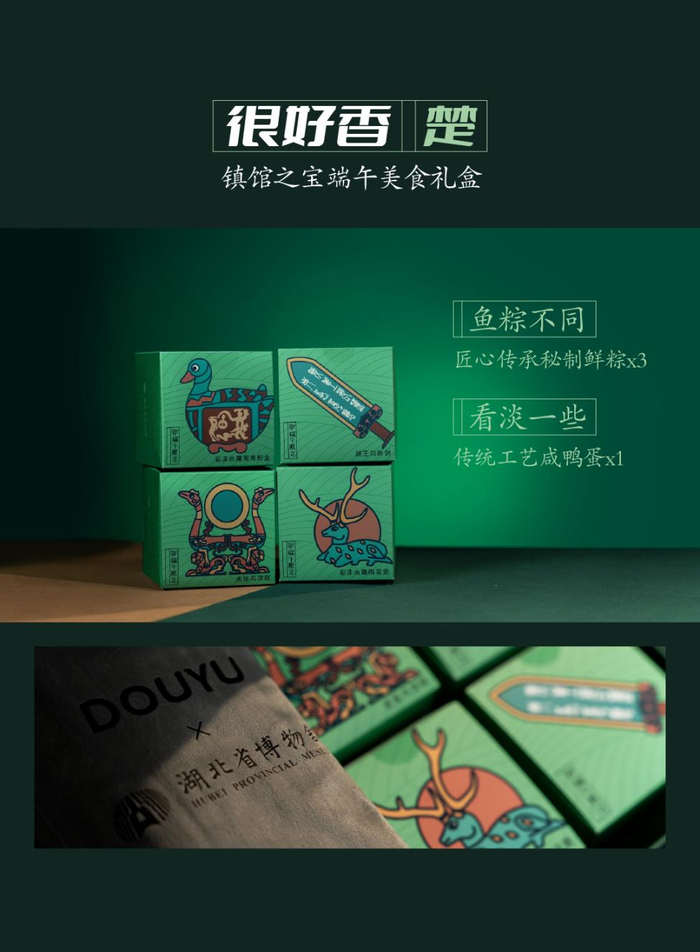为庆祝即将到来的端午佳节,国内领先直播平台斗鱼携手湖北省博物馆共同推出了名为“如此楚粽”的国潮风联名礼盒。