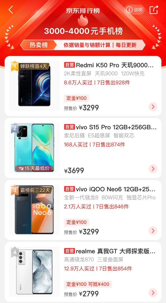 Redmi K50 Pro发力 连续4天蝉联京东3000-4000元手机榜冠军