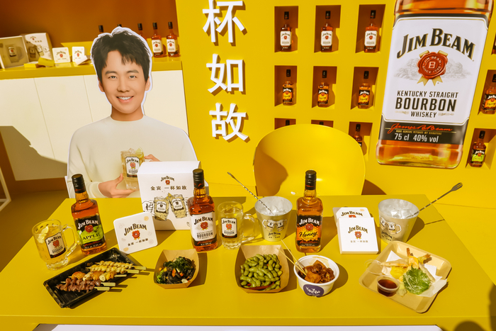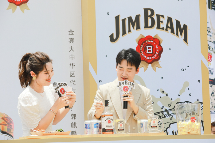 现场观众入场即可以兑换两杯现场调制的金宾嗨棒,1:4比例的威士忌加苏打水,搭配冰块和柠檬,口感清爽解油腻,在家也能轻易调制。