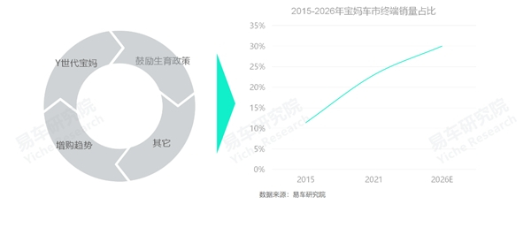 十四五期间,宝妈用户将扩大至整个Y世代、鼓励生育政策将加速落地、增购占比将持续提升等内外因,持续助力宝妈车市。2026年宝妈车市的份额有望达到30%,销量有望突破600万辆,将超过紧凑型轿车与紧凑型SUV的销量,继小镇青年之后,宝妈车市将成为中国乘用车市场的“新黄金车市”;