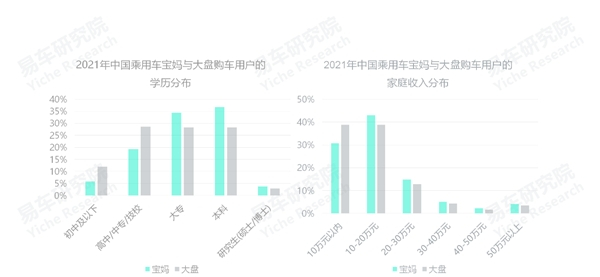 宝妈用户的教育程度高于大盘水平,2021年接近75%的宝妈用户拥有高等学历,大盘为60%。学历越高,思维、意识等会更前瞻,相对更能接受前沿设计等,提升中国车市的审美价值。未来在中国车市热销的车型,不见得就是中庸设计;