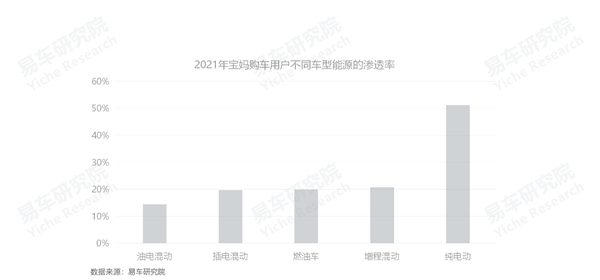 2021年,在各大能源形式的渗透率排行中,宝妈用户对更时尚的纯电动情有独钟,渗透率高达51.19%。相对而言,电动车的操控性、静谧性、科技感等更突出,对女性用户会友好很多。