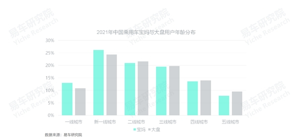 宝妈用户的城市分布高于大盘水平,2021年超60%的宝妈用户分布于大城市,大盘50%多点。城市越大,也会越多元越包容,相对更能滋润创新意识在,助力新型车企的发展。未来在中国车市热销的车型,不见得就是主流车企生产的;