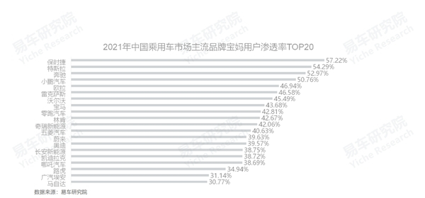 2021年,宝妈渗透率最高的主流品牌是保时捷,高达57.22%,一方面解释了保时捷在华表现坚挺的原因,另一方面也提醒着相关品牌——老娘不是好惹的,该召回就召回,该补偿就补偿。特斯拉、奔驰、小鹏紧随其后,宝妈渗透率分别为54.29%、52.97、50.76%,都超过50%;
