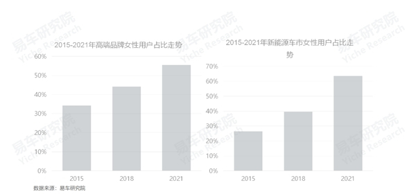 除中国乘用车整体开始向女性倾斜外,高端与新能源两大车市更是如此。2015-2021年,女性对高端品牌的销量贡献由34.22%升至55.43%,对新能源车市的销量贡献由26.38%升至63.57%,清一色成为两大细分车市的消费主体。再加高端车型售价偏高,电动车以家庭增购为主,意味着两大细分车市的多数女性用户是具有一定年龄的宝妈;