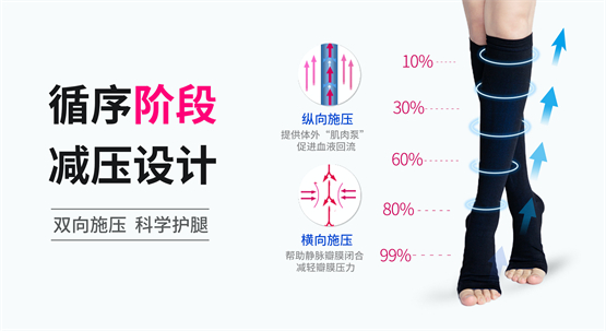 产品上束口加高至4厘米以及下束口加大的设计,不仅可以有效缓解膝盖窝(腘静脉)的压力使其穿戴舒适不勒,还可以把束口排除出压力范围,使较大压力建立在袜身的脚踝处。可谓对其穿戴的舒适性方面进行了全面创新升级,即使是第一次穿戴的人群也无需适压,给用户带来了全新的穿戴体验。