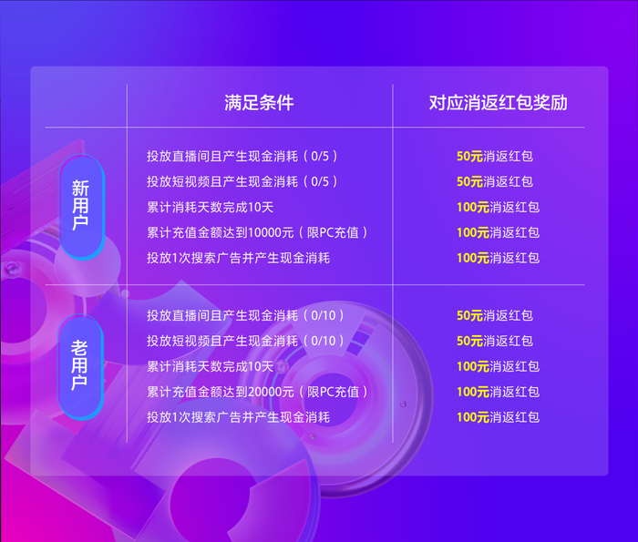 超级任务奖励, 面向全量用户、针对直播间、短视频投放充值、消耗金额而产生的活动,分为新用户和老用户两个赛道。根据活动期间充值或消耗的现金金额不同,商家将获得相应的消返红包。