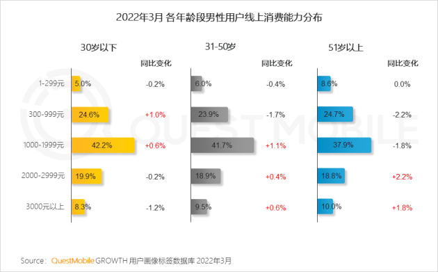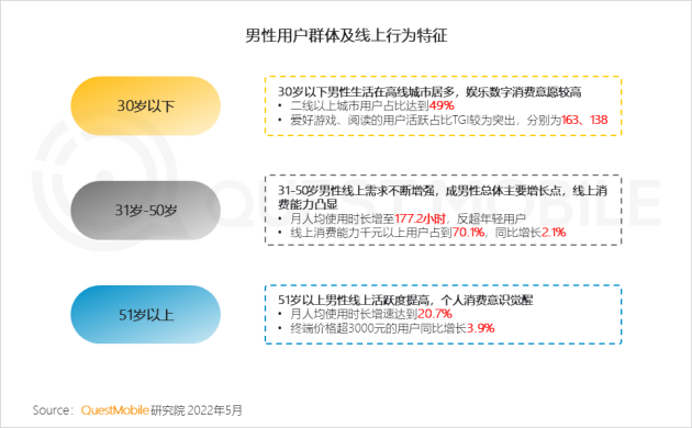 但这种情况在近两年似乎有所改观。据QuestMobile研究院显示,网络男性群体行为画像特点鲜明,其中31-50岁中年男性线上需求不断增强,成为男性总体主要增长点,线上消费能力凸显。