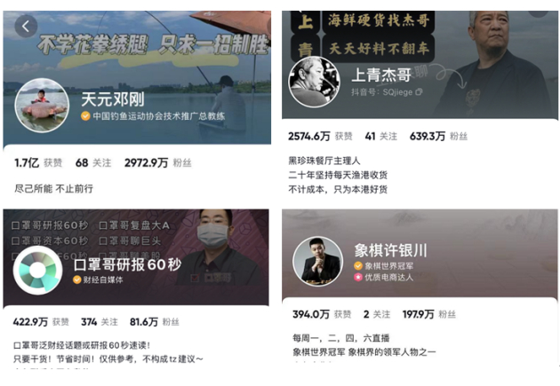 这个口碑策略在抖音上有天然的适配性。在抖音,我们发现更多中年男人的世界。野外钓鱼、财经股市、三农美食、象棋围棋,用户群体90%是男性,而30岁以上男性占据超50%。在流量池足够大的前提下,小众创作者专业有趣的内容的持续输出,粉丝从0慢慢增长到100万甚至更多,这个过程本身就已经是小众走向了大众,也具备了更多可能性。