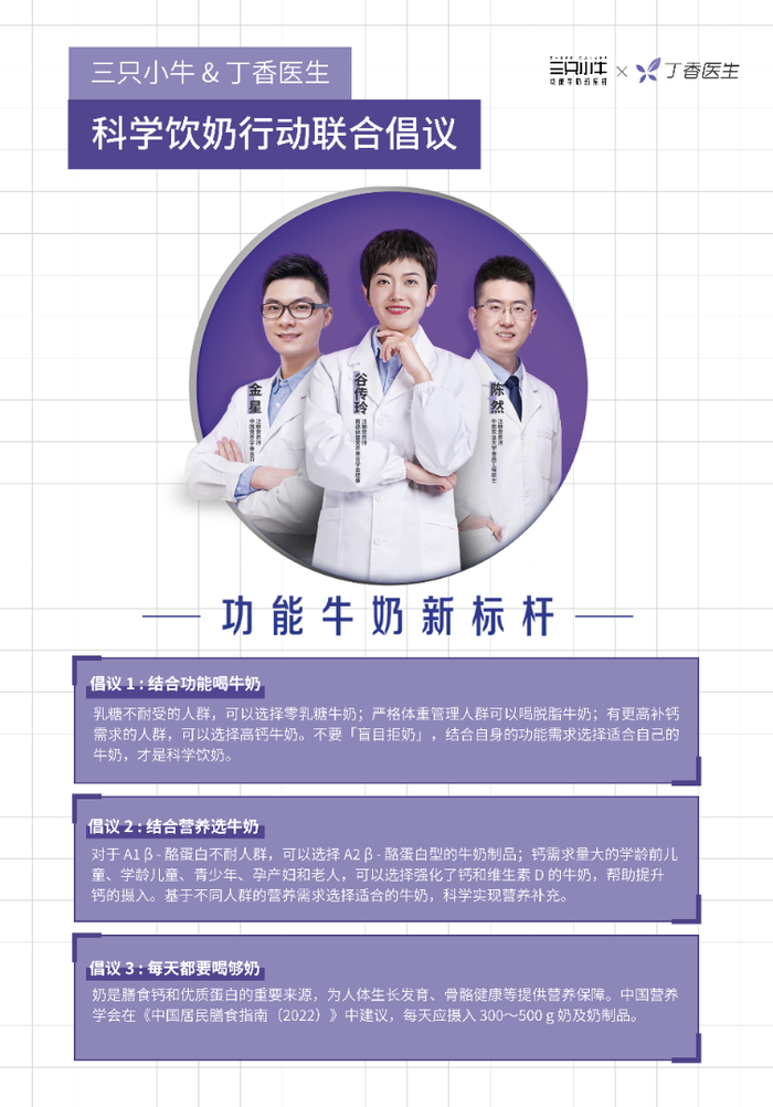 在打造高标准、高品质产品的同时,三只小牛也在持续推进国民科学饮奶的研究。近期,三只小牛联合国内专业健康平台丁香医生,开展了一系列科学饮奶科普活动,旨在洞悉消费者对饮奶的品质和功能需求,持续向消费者传递科学的饮奶观念。