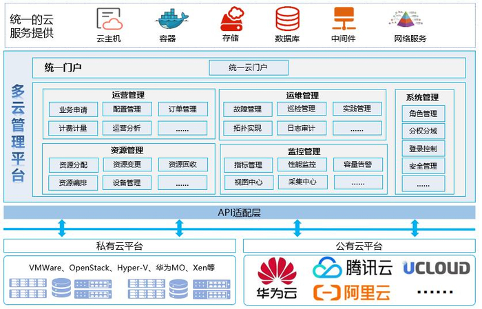1. 多云异构资源管理 :支持对跨域、跨数据中心、异构厂家的私有云、公有云的统一资源管控,提供云资源生命周期的统一管理;