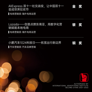 IAI传鉴国际广告奖是业内知名的综合性广告与品牌营销赛事奖项,由中国传媒大学广告学院、中国商务广告协会、IAI国际广告研究所创办。在今年赛道竞争愈发激烈、获奖难度提升的情况下,飞书深诺超越以往表现,再创佳绩。凭借雅迪、安踏ANTA、vivo的案例,飞书深诺在出海营销组别斩获1银1铜1优秀奖,凭借AliExpress、Lazada、小鹏汽车案例摘下电商营销金奖和银奖,以及汽车营销铜奖。