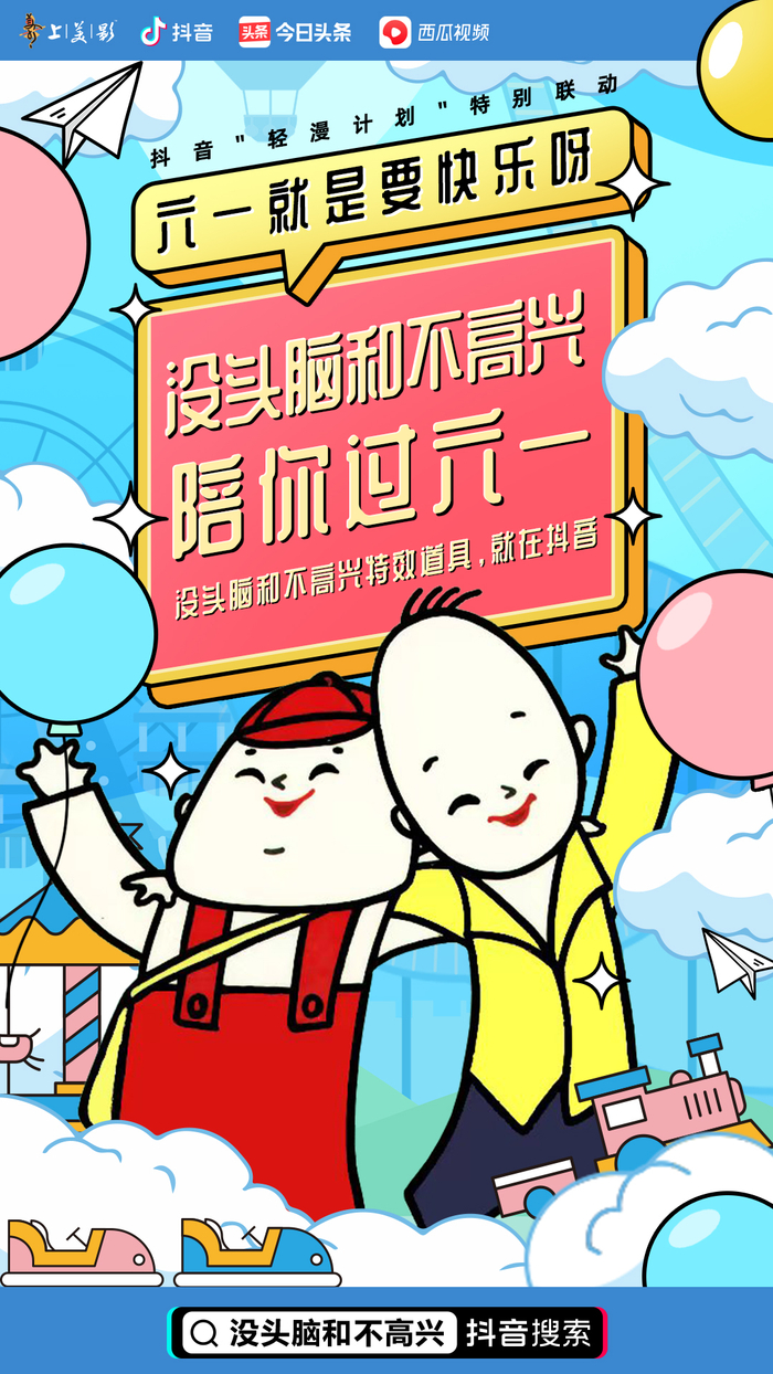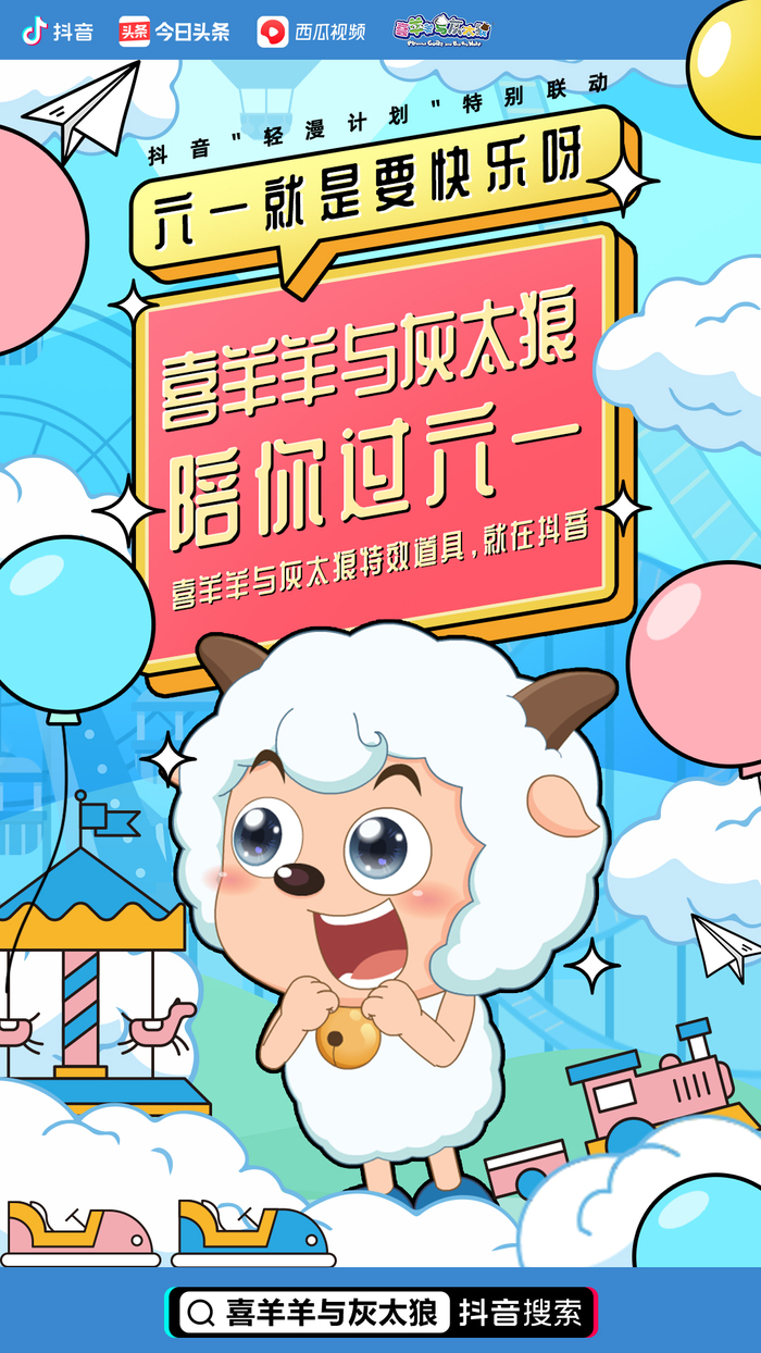还有轻漫六一派对云创意玩法:6月1日晚8时喜羊羊在直播间带领众人混入羊村,在青青草原线上参加云舞会;来自熊出没的熊二线上发起比心舞挑战,短视频云擂台与网友们PK舞技;除此之外,抖音轻漫计划的众多轻漫新星也作为新的童年伙伴给大家送上特别礼物:一禅小和尚空降明星郝邵文直播间,跨次元重温经典;我是不白吃线上生日会和国风合伙人楚淇带你穿越童年美食;还有小品一家人、小P的家人们、唐唐、飞狗MOCO、猪屁登、MR.BRON、虎墩小镖师、熊猫班卜、斑布猫、乐儿与果果、小蓝和他的朋友们等众多原创轻漫IP带来六一主题动画剧场。