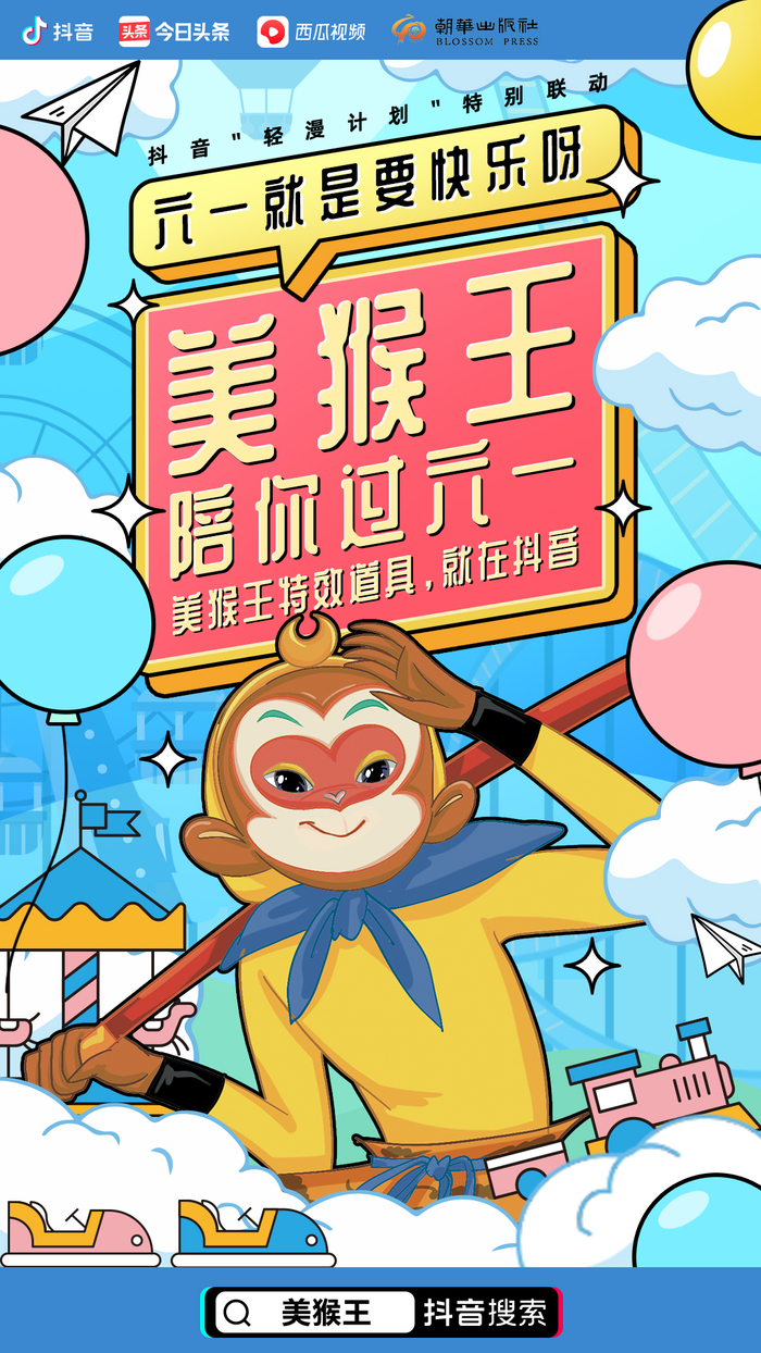 2022年的儿童节,美猴王正式入驻抖音。抖音与轻漫计划特别策划,通过特效技术让美猴王从2D到3D“活了”起来。用户使用美猴王特效道具贴纸,不仅能看到美猴王,更能一秒“变身”为美猴王。不少孩子总是幻想过和齐天大圣一起拯救世界,他们在今年儿童节终于可以“圆梦”,穿上金甲,头戴金冠,手举金箍棒,成为梦中英雄的模样。同时,这款美猴王道具不仅仅是孩子们的专属,也是成年人找回童年的“时光机”,在儿童节短暂的一天中回到儿时无忧无虑的状态。