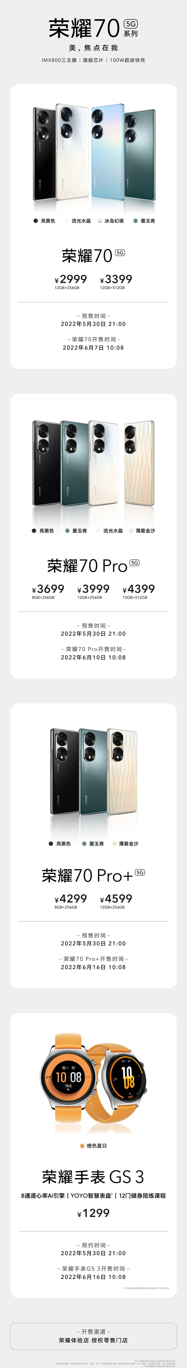 荣耀70 Pro售价3699元起、荣耀70 Pro+售价4299元起。