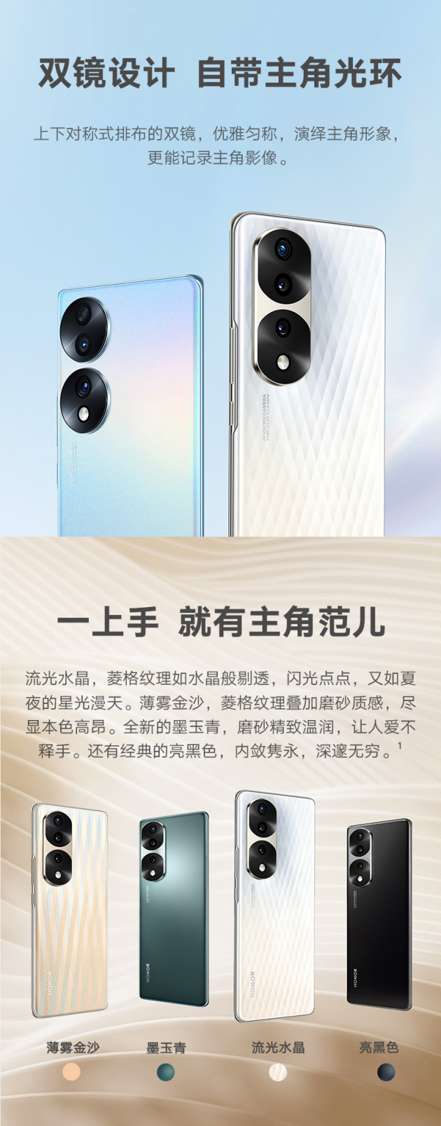 荣耀70 Pro流光水晶、薄雾金沙、墨玉青、亮黑色四款配色典雅大气,