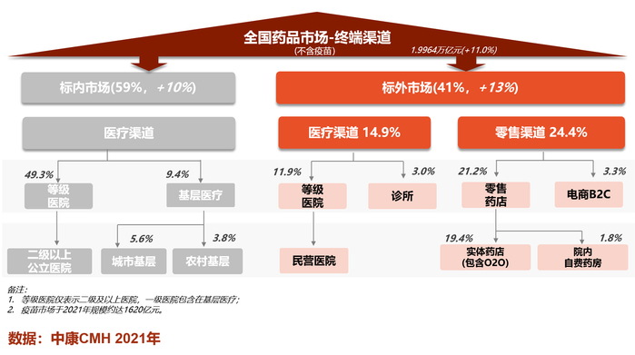2021年,标外市场规模达到8267亿元,占全国药品终端市场41%,增速高达13%,比标内市场增速高3个百分点,2022年预计增速达到6.7%。其中实体药店、院内自费药房、电商B2C在2020年收获疫情红利基础上进一步引领渠道增长。