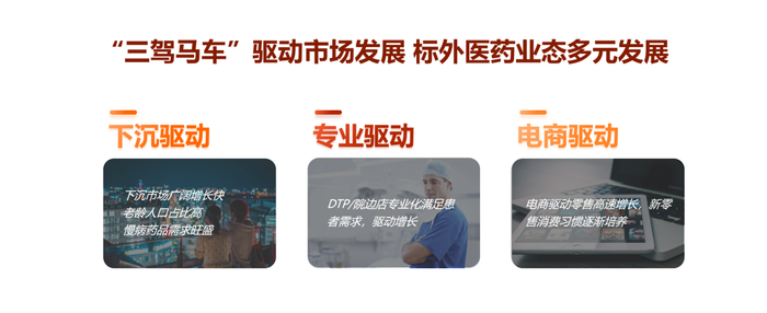 渠道上,由“三驾马车”驱动市场发展,分别为下沉驱动、专业驱动、电商驱动,标外医药业态呈现多元发展。