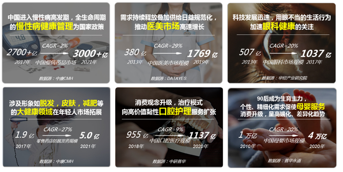 赛道方面,受政策鼓励和资本推动影响,2019年,大健康产业在患者服务类领域、医疗服务类领域、医药服务类领域、医疗美容类领域和医疗保健类领域等细分场景快速发展。