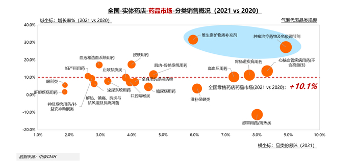 在品类方面,药品市场在实体药店整体占比近80%,促使实体药店保持低速增长。其中,化学药及生物制品为主要驱动,2021年同比双位数增长。尤为引人注意的是,在新药上市的驱动下,生物制品实现高达24%的高增幅。