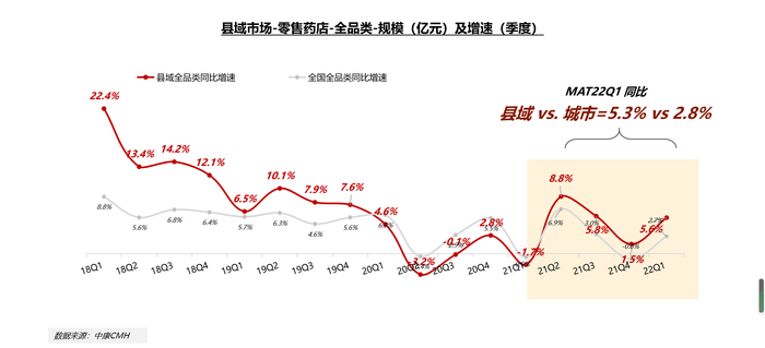 下沉市场广阔、增长快,老龄人口占比高,慢病药品需求旺盛。中康CMH数据显示,MAT22Q1,零售药店全品类在县域市场全年规模达到1597亿,市场占比达到32%。2021年以来,全品类县域市场规模呈恢复态势,同比实现5.3%的增长,增速快于全国。