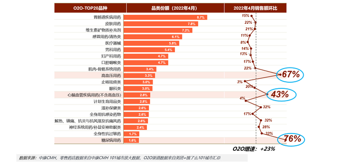 值得注意的是,电商驱动零售高速增长,新零售消费习惯逐渐培养,将会对终端格局产生较为长远的影响。其中O2O品种格局方面,疫情防控政策下患者外出困难,慢病刚需用药在O2O快速增长。