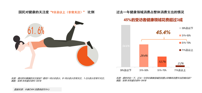 根据中康CMH对5418份消费者调研结果显示,国民对健康关注度达“9分及以上(非常关注)”的比例高达61.6%,过去一年近半数受访者在健康领域消费占整体消费支出超过30%。