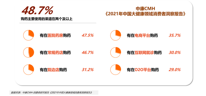 随着标外市场发展,患者多元化购药,标外全渠道共振时代来临。中康CMH-消费者研究报告《2021年中国大健康领域消费者洞察报告》显示,购药主要使用的渠道在两个及以上的人群已经高达48.7%,包括医院药房、常规药房、院边店、电商平台、互联网就诊、O2O平台都占到了不低的比例。如有在互联网就诊购药的人群占到30%,有在电商平台购药的人群占到35.7%等等,这些都是值得我们去重点关注的新形态。