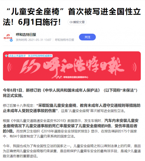 立足“儿童安全座椅法律”,不断提升产品制造品质